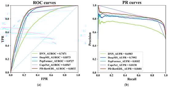 Since the ROC curve and PR curve can more intuitively compare the performance of each predictor, the ROC curve and PR curve of PD-BertEDL and other predictors on the independent test set of Homo sapiens were plotted in this paper, as shown in Figure 2.