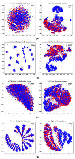 In this paper, we combined sequence information, physicochemical information, and context information derived from sequences to characterize peptides for the prediction of peptide detectability. To verify that all three kinds of information contribute to the prediction of peptide detectability, we performed visual verification using t-SNE on the independent test set of Homo sapiens, based on two modes of single information and three combinations of information. The initial coding vectors of all samples and high-level abstract features extracted from models based on different information are projected into a two-dimensional space, and the space is scaled to the interval [−1, 1]. The results are shown in Figure 3.