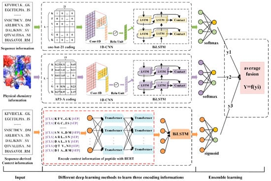 Ensemble deep learning strategy combines ensemble learning and deep learning technology, and can “specialized” a single feature set [], using different deep learning methods can learn the representation of a single feature set. The ensemble deep learning strategy integrates the learning and classification results of multiple deep learning models based on a single feature set, to solve the problem of heterogeneous data combination and realize the multi-faceted abstraction of data []. This strategy is currently widely used to predict different biological data, such as anti-tuberculate peptides [], antimicrobial peptides [], recognition of non-classical secreted proteins [], DNA recombination points [], etc., and has been shown to help improve prediction performance and model generalization.