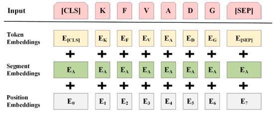 In order to fully capture the context information of the peptide, we regarded the peptide sequence as a sentence, and took k amino acids as a group, which was called “word” []. Since the parameter scale of BERT model is up to 100 million, it is very demanding for the experimental environment to use our own corpus to build a word list and retrain the BERT model. In addition, in the study of classification prediction using BERT, some research proved that the optimal results could be obtained when k = 1 was used [,]. Therefore, k was set to 1, and the peptide sequence of length L was divided from beginning to end to obtain L “words”. In this paper, the token sequence is an array composed of a single amino acid in the sequence. The token sequence is input into the BERT model to obtain the embedding vector representation of each amino acid. Given a sequence P = (, ,…, ) ( refers to each amino acid), the tokenizer transforms the sequence P and obtains the mapping ids table of the sequence, where the first CLS is the sentence vector and the last SEP is the spacer. For sequence P, we can obtain token embeddings (1, L, 256), segment embeddings (1, L, 256), and position embeddings (1, L, 256) after three layers of coding representation. A synthetic representation of size (1, L, 256) is obtained using equations (1) and fed into the BERT model.