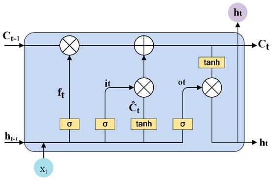 After the LSTM unit receives the input data, the first step was to decide which information to keep through the “forgetting gate” and the output of the last moment. The second step was divided into two parts. Firstly, generating new information through the “input gate”; Second, new information was added through the tanh layer to update the current unit state. The third step was to get the output of LSTM unit through “output gate” and tanh layer. The calculation process of LSTM element at time step is shown in Equations (6)–(10).