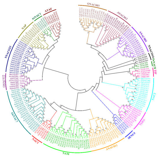 Gene family analysis as a basic method plays an important role in investigating the functions of plant transcription factors. The members of the NAC family have been identified and reported in many species by gene family analysis. For instance, 108 members have been identified in Arabidopsis, 151 members in rice, 150 members in soybean, 261 members in M. sinensis, 132 members in peanut, 151 members in sunflower, 87 members in maize, 111 members in celery, 104 members in pepper, and 110 members in potato [6,7,8,9,10,11,12]. NAC proteins have not only been identified, but their functions have also been well studied. NAC TFs play important roles in many vital biological processes and plant stress responses [13,14,15,16,17,18].