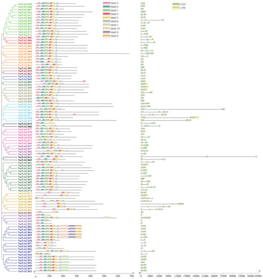 The structures of NAC genes and NAC proteins. The left represents the phylogenetic relationship of NAC genes. The middle represents the conserved motifs in NAC proteins, in which different colors represent different motifs. The right represents the intron–exon structures of NAC genes. The exons, introns, and untranslated regions (UTRs), are indicated by the green boxes, black lines, and yellow boxes, respectively.