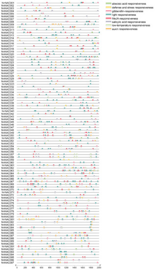 The sequence features including introns, exons, and motifs were visualized by the TBtools software [52]. According to the frequency of occurrence, motifs 1–5 were the five most frequently presented motifs, covering almost all NAC members. Furthermore, motifs 8–10 only existed in the members NnNAC082, 083, 084, 085, and 031, which belong to subgroup NNAC023. Interestingly, NnNAC009 and NnNAC017 possessed two copies of motif 3. In addition, the motifs in subgroup ONAC003 showed a character of random arrangement. The exhibition of exon–intron structure showed that there is evolutionary diversity. Most of the members had more than three exons, and only four members had one exon. NnNAC069, 27, 28, and 79 possessed relatively longer intron lengths (Figure 3).