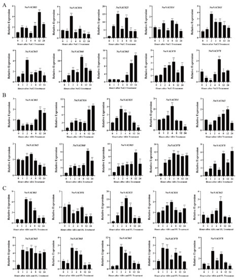 Relative expression levels of lotus NAC genes. qRT-PCR analyses of plants treated with NaCl (A), ABA (B), and ABA + FL (C). Independent t-tests demonstrated that there was significant difference (* p <0.05, ** p < 0.01).