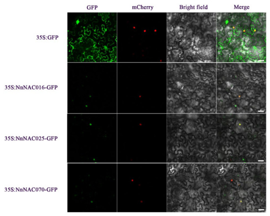 Subcellular localization of the soybean NAC proteins. The first row of pictures above is a control, and those below it are the NnNAC016, NnNAC025, and NnNAC070 proteins. Scale bars = 25 μm.
