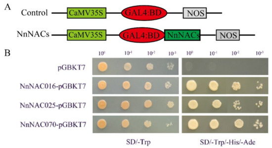 Transcription factors generally have self-activation ability. The full-length cDNAs of NnNAC16, NnNAC25, and NnNAC70 were cloned into a PGBKT7 vector, and the self-activation ability of NnNAC16, NnNAC25, and NnNAC70 was verified by yeast experimentation. The results showed that NnNAC16, NnNAC25, NnNAC70, and the negative control pGBKT7 could all grow colonies on an SD/-Trp medium, while only the negative control pGBKT7 failed to grow colonies on an SD/-Trp/-Ade/His medium. This indicated that NnNAC16, NnNAC25, and NnNAC70 all had self-activation ability (Figure 7).