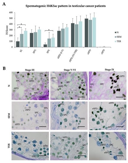 - Barrachina, F.; de la Iglesia, A.; Jodar, M.; Soler-Ventura, A.; Mallofré, C.; Rodriguez-Carunchio, L.; Goudarzi, A.; Corral, J.M.; Ballescà, J.L.; Castillo, J.; et al. Histone H4 Acetylation Is Dysregulated in Active Seminiferous Tubules Adjacent to Testicular Tumours. Hum. Reprod. 2022, 30, 1712–1726. [Google Scholar] [CrossRef]