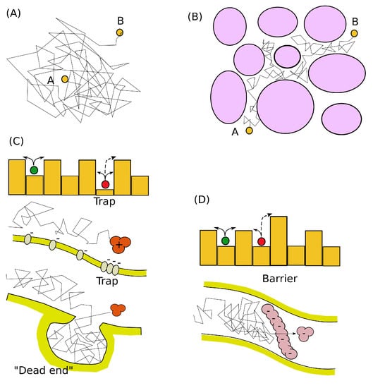 (A) The free diffusion process represented by a single particle trek (random walk) from point A to point B; (B) The random walk through obstacles can be treated as free diffusion over a longer distance using effective diffusion coefficient and tortuous parameter; (C) The theoretical model of trapping implies the existence of low-potential sites which are difficult for a particle to escape. It may be represented either by the locally charged molecules or by ”dead ends” of extracellular space; (D) The theoretical model of the barrier assumes the presence of a region that requires high energy to overcome it. In extracellular space, it may have the form of large charged molecules of the extracellular matrix.
