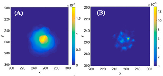 Examples of concentration distributions of a marker spreading from a single point within Hänggi–Klimontovich’s (A) and Ito’s (B) realisations of the random walk in the medium with Gamma-distributed and then locally correlated (with the correlation length lattice sites) local diffusivity. Reproduced from [69] (published there under Creative Commons Attribution 4.0 licence).