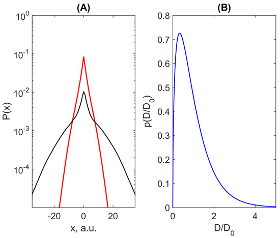 (A) Examples of evolution of probability density function for the Brownian yet non-Gaussian diffusion in 2D heterogeneous media simulated accordingly to the equilibrated Ito scheme for two time moments (, red line, and , black line) adapted from [69] (published there under Creative Commons Attribution 4.0 licence) (A) and the Gamma-distribution of diffusion coefficients mimicking the heterogeneity of the medium, respectively, to the uniform value (B).