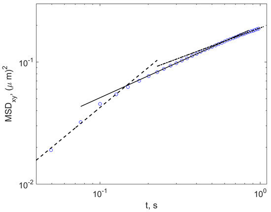 Another example is the results of simulation studies for tracers spreading in polymer gels with irregular voids and tortuous paths [92]. The three-stage evolution of the MSD quite similar to Figure 5 and with the close value of can be observed there. Note that kind of materials attracts recently attention as phantoms mimicking brain tissue [57].