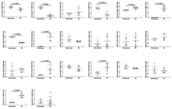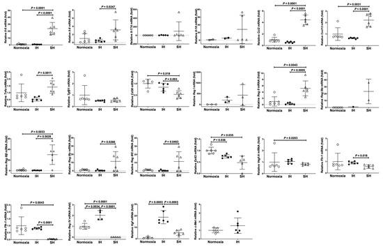 The mRNA levels of rat Il-6, Il-33, Il-17A, Il-18, Tgfβ1, Cxcl12, Tnfα, Ccl2, Vegf-A, Flt-1, Flk-1, Cd38, Reg I, PAP I, PAP II, PAP III, Reg IV, Extl3, Hgf, and c-Met in rat H9c2 cardiomyocytes. Rat H9c2 cells were treated with normoxia or IH for 24 h. The mRNA levels were measured by real-time RT-PCR and normalized by rat insulinoma gene (Rig)/ribosomal protein S15 (RpS15) as an internal standard. The mRNA levels exposed to normoxia were set to 1.0. Open and closed circles indicate values of relative mRNA expression of cells exposed to normoxia and IH, respectively. Data are expressed as the mean ± SD of the samples. Statistical analyses were performed using Student’s t-test. IH significantly increased the mRNA levels of Tgfβ1, Tnfα, Ccl2, Flt-1, Hgf, and Reg IV in rat H9c2 cells. IH significantly decreased the mRNA levels of Il-6, Il-33, Il-18, and Cxcl12 in rat H9v2 cells. The other gene expressions (Il-17A, Cd38, Reg I, PAP I, PAP II, PAP III, Extl3, c-Met, Vegf-A, and Flk-1) did not show significant changes.