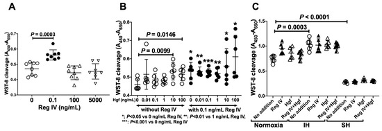 To evaluate the direct effects of Reg IV and Hgf on cardiomyocyte proliferation, differentiated P19.CL6 cells were incubated with Reg IV and Hgf for 24 h. Following the SH treatment, cell viability was determined by using a WST-8 (2-[2-methoxy-4-nitrophenyl]-3-[4-nitrophenyl]-5-[2,4-disulfophenyl]-2H-tetrazolium monosodium salt) assay. P19.CL6 cell proliferation was significantly increased by 0.1 ng/mL Reg IV (Figure 4A) and 10–100 ng/mL Hgf (Figure 4B), and the 0.1 ng/mL Reg IV-induced proliferation was further enhanced by the combined addition of Hgf (Figure 4B). P19.CL6 cell numbers were significantly increased by IH and dramatically reduced by SH (Figure 4C).