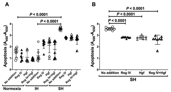 (A) Anti-apoptotic effects of Reg IV and Hgf in differentiated P19.CL6 cardiomyocytes in normoxia, IH, or SH. IH did not increase apoptosis and SH increased apoptosis (p < 0.0001 vs. normoxia; p < 0.0001 vs. IH). (B) Anti-apoptotic effects of Reg IV and/or Hgf in SH. Apoptosis was quantified using the TUNEL method. Mouse recombinant Reg IV (0.1 ng/mL) and Hgf (0.1 ng/mL) were added to differentiated mouse P19.CL6 cell culture medium and incubated in normoxia, IH, or SH for 24 h. Data are expressed as mean ± SD for each group. The statistical analyses were performed using Student’s t-test.