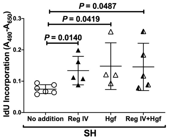 We then measured the replicative DNA synthesis of SH-treated P19.CL6 cells by 5-iodo-2′-deoxyuridine (IdU: pyrimidine analog) incorporation. As shown in Figure 6, replicative DNA synthesis was significantly increased by the addition of Reg IV and/or Hgf in SH-treated cardiomyocytes.