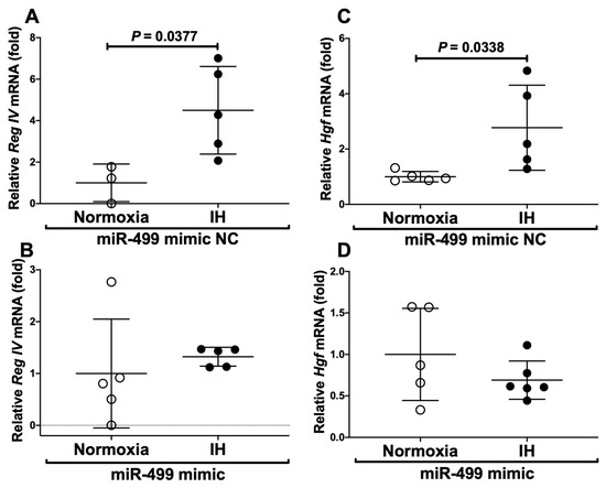 We considered the possible explanation that IH-induced up-regulation of Reg IV and Hgf was controlled post-transcriptionally. Therefore, we searched the targeted miRNA using the MicroRNA.org program (http://www.microrna.org/microrna/home.do, accessed on 29 October 2021), which revealed that Reg IV and Hgf mRNAs have a potential target sequence for miR-499. There were no other miRNA candidates targeting both genes. We measured the miR-499 levels of IH-treated cells by RT-PCR and found that the level was significantly lower than that of normoxia-treated cells (0.3229 folds vs. normoxia, p = 0.0029). The possible reasons as to why the level of miR-499 was decreased by IH include the following: mRNA levels of some enzymes involved in miRNA biosynthesis are influenced by IH, and the level of miR-499 was specifically decreased by IH either via decreased biosynthesis or enhanced degradation. We measured the mRNA levels of ribonuclease type III (Drosha) and endoribonuclease Dicer (Dicer), which are involved in the biosynthesis of miRNAs [37,38] and found that their expression was unchanged by IH (Figure 8: p = 0.2200 and p = 0.1299, respectively).