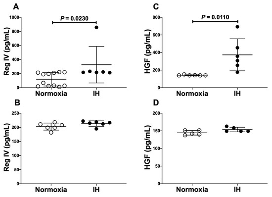 We further measured Reg IV and Hgf proteins in the culture medium of differentiated P19.CL6 cells by the enzyme-linked immunosorbent assay (ELISA). We found that the levels of Reg IV and Hgf were significantly increased by IH (Reg IV [30.16 pg/mL vs. 91.83 pg/mL, p = 0.0025], and Hgf [101.9 pg/mL vs. 106.3 pg/mL, p = 0.0046]) (Figure 3).