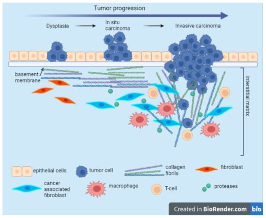 Evolution of collagen fibril organization during tumor progression. During carcinogenesis and cancer development, tumor cells surpass the physical barrier represented by the basement membrane and the interstitial matrix. This event is associated with the enhancement of the activity of the CAFs being able to secrete and reorganize the collagen fibers, increasing the matrix stiffness. Tumor associated macrophages (TAM) and CAFs contribute to collagen remodeling and degradation due to secreted proteases. Modified collagen fibers shift their orientation, allowing migration of invading cancer cells. This image was created with BioRender (https://biorender.com/ (accessed on 30 September 2022)).