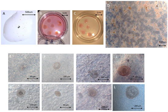 Photography of follicles in fibrin scaffolds. (A) Fibrinogen–thrombin complex including follicles in the unsolidified state. (B,C) General view of an artificial ovary on day 0 (B) and day 7 with a dissociated scaffold (C). (D) Optimal microscopy image of artificial ovary on day 0. (E,F) Viable primordial follicle in fibrin on day 0 (E) and day 3 (F). (G) Dead primary follicle on day 7. (H) Viable primordial follicle on day 7. (I) Viable secondary and primordial follicles in fibrin on day 3. (J) Dying secondary follicle in fibrin on day 7. (K) Viable secondary follicle in fibrin on day 3. (L) Viable secondary follicle in fibrin on day 7.