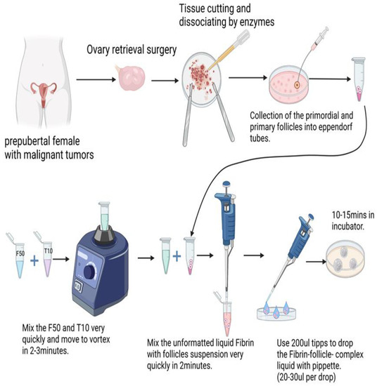 Fertility preservation options for prepubertal girls with malignant tumors include ovarian transposition, ovarian tissue cryopreservation, auto-transplantation after sexual maturity, and ovarian tissue culture in vitro [7,8]. However, these options are associated with the risk of re-introducing cancer cells [9,10,11]. Ovarian tissue dissociation using enzymes followed by the selection of follicles for in vitro cultures is considered a relatively safe method with a low risk of introducing cancer cells [12,13,14].