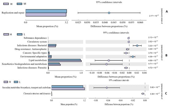 - Parks, D.H.; Tyson, G.W.; Hugenholtz, P.; Beiko, R.G. STAMP: Statistical analysis of taxonomic and functional profiles. Bioinformatics 2014, 30, 3123–3124. [Google Scholar] [CrossRef] [PubMed]