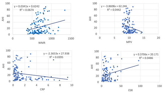In the entire study group, AHI was significantly correlated with NLR, WMR, RDW, MPV, ESR and CRP (Table 2, Figure 1 and Figure 2). However, subgroup analysis showed most statistically significant correlations remained significant only in patients with severe OSA—WMR (p < 0.001) and CRP (p = 0.019). PLR exhibited a positive strong association with OSA severity in controls (p < 0.001) and patients with mild OSA (p < 0.001), but a mild negative association in patients with severe OSA.