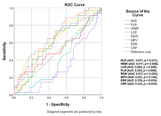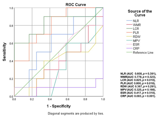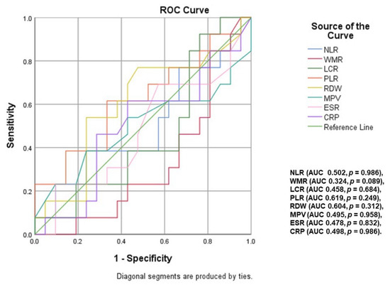 Impact of inflammatory parameters in predicting severe OSA (NLR: neutrophil–lymphocyte ratio; WMR: white blood cell count-to-mean platelet volume ratio; LCR: lymphocyte-to-CRP ratio; ESR: erythrocyte sedimentation rate; CRP: C-reactive protein; PLR: platelet-to-lymphocyte ratio; RDW: red cell distribution width; MPV: mean platelet volume).