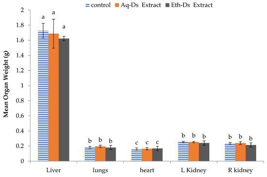 Mean organ weight of normal and extract-treated mice. No statistical difference was observed among the mice from control, Aq-DS or Eth-DS extract-treated mice liver, lungs, heart and kidneys. Groups: Eth-DS: Ethanolic extract of DS, Aq-DS: Aqueous extract of DS. Letter a, b or c above each bar is the standard error which indicates that the values are significant.