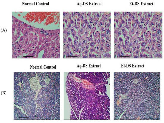 Histopathological photomicrographs of normal control, Aq-DS (aqueous extract of DS group) and Et-DS (ethanolic extract of DS group) extracts administered at 500 mg/kg, single dose in (A) Liver, normal hepatic cells and well-preserved cell organelles without pathological alterations are evident in Hematoxylin and Eosin stained sections (5 µm thick) at 40× magnification; (B) Pancreas, normal islets of Langerhans without pathological alterations are evident in Hematoxylin and Eosin stained sections at 10×. Scale Bars: (A,B) = 0.2 cm.