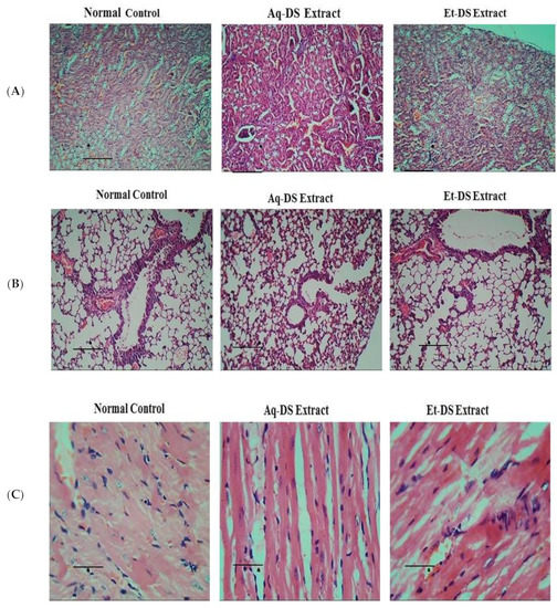 Histopathological photomicrographs of normal control, Aq-DS (aqueous extract of DS group) and Et-DS (ethanolic extract of DS group) extracts administered at 500 mg/kg, single dose in (A) Kidney, normal structures of renal corpuscles and renal tubules without pathological signs are visible in Hematoxylin and Eosin stained sections (5 µm thick) at 40× magnification; (B) Normal histology of lung showing bronchioles and alveoli without pathological signs in Hematoxylin and Eosin stained sections (5 µm thick) at 40× magnification; (C) Clear cardiac muscle fibers without pathological signs are evident in Hematoxylin and Eosin stained sections (5 µm thick) at 40×. Scale Bars: (A,B) = 1.5 cm, (C) = 0.8 cm.