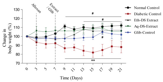 Variability in the body weight percentage (Mean ± SD, n = 6) of diabetic mice treated with glibenclamide and DS extracts, # p < 0.05, ** p < 0.01. (Eth-DS. Ethanolic extract of DS, Aq-DS. Aqueous extract of DS, Glib. glibenclamide treated group).