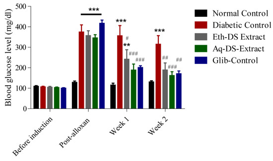 Before the induction of diabetes, results revealed normal blood glucose levels (95–110 mg/dL) in all groups (Figure 5). However, upon induction of diabetes, significantly higher blood glucose levels (p < 0.001) were observed in all experimental groups (Diabetic Control, Eth-DS Extract, Aq-DS Extract and Glib-Control) except for normal control. After one week of treatment, a significant decrease in blood glucose levels (p < 0.001) of three experimental groups i.e., Eth-DS extract, Aq-DS extract and Glib-Control was detected, compared to diabetic control. Similar results in the blood glucose levels were observed in the second week of treatment. However, the group treated with Aq-DS extract potentially had a lowered blood glucose level at the second week reaching 150 mg/dL and exerted stronger anti-diabetic effects, compared to Eth-DS extract (190 mg/dL). Groups treated with both extracts showed comparable blood glucose levels with the glibenclamide treated mice during the experiment.