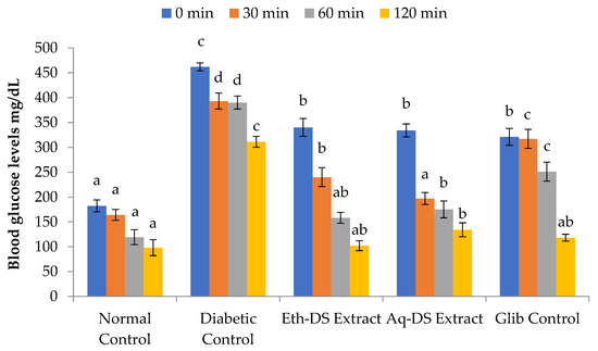Comparative study of variability in glucose tolerance levels at various time intervals. A relatively maintained level of blood glucose in Eth-DS, Aq-DS extracts treated groups and in Glib control mice in sharp contrast to elevated blood glucose levels in diabetic mice. Different letters indicate significant difference among groups. (Eth-DS: Ethanolic extract of D. stewartii, Aq-DS: Aqueous extract of D. stewartii, Glib: glibenclamide treated group).