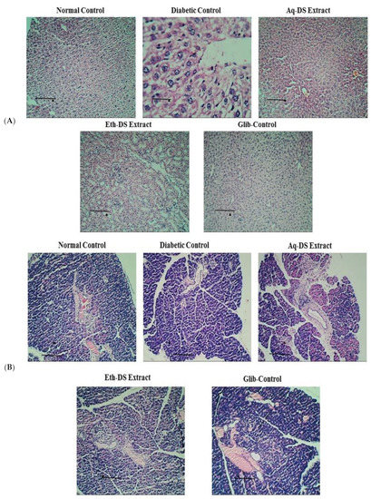 Photomicrographs of the effect of different treatments on (A) Liver architecture. Liver of control group showed normal hepatocytes architecture. Photomicrograph of diabetic group exhibited cell necrosis and sinusoidal dilation. Photomicrograph of aqueous and ethanol extract (500 mg/kg) treated groups revealed almost same morphology as normal group with normal hepatocytes architecture (H & E stain, ×10 & 40). (B) Pancreas, Pancreas of normal control mice showed normal islets surrounded with exocrine portion. Pancreas sections of diabetic mice revealed necrosis and shrinkage of islet cells. In photomicrographs from aqueous extract (500 mg/kg) treated group, enlarged islets were evident. Improved islet size and normal pancreatic structure was observed in pancreas of ethanol extract (500 mg/kg) and glibenclamide (5 mg/kg) treated groups (H & E stain, 10× & 40×). Scale Bars: (A,B) = 0.5 cm. (Eth-DS: Ethanolic extract of DS, Aq-DS: Aqueous extract of DS, Glib: glibenclamide treated group).