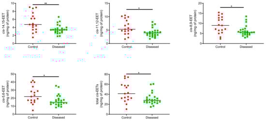 Individual cis-EET and total cis-EETs extracted from control (n = 17) and diseased (n = 24) human cardiac tissues. ** indicates p ≤ 0.01 and * indicates p ≤ 0.05.