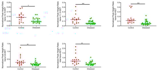 Normalized peak heigh ratio of each trans-regioisomer of EETs and total trans-EETs extracted from control and diseased human cardiac tissues. *** indicates p ≤ 0.001, ** indicates p ≤ 0.01, and * indicates p ≤ 0.05.