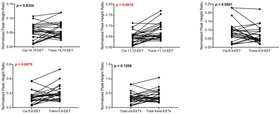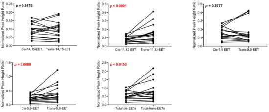 Comparison of total cis-EETs and corresponding total trans-EETs among the different regioisomers in diseased cardiac tissue. Connected lines between two points indicate matched pairs of total cis- and trans-EETs from the same samples.
