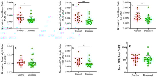 Normalized peak height ratio of each regioisomer of DHETs (A–E) and ratio of total cis-EETs to total DHETs (F) extracted from control and diseased human cardiac tissue. *** indicates p ≤ 0.001, ** indicates p ≤ 0.01 and * indicates p ≤ 0.05.