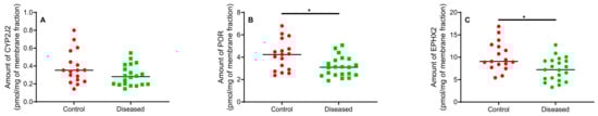 Protein levels of cPLA2𝑎, Lp-PLA2, LPCAT1, and HMOX1 were below the limit of detection for most samples and could not be analyzed further. CYP2J2, POR, and EPHX2 levels allowed for absolute quantitation. In general, control cardiac tissues exhibited markedly higher protein levels compared to diseased tissue (Figure 7). CYP2J2 protein levels were lower in diseased cardiac tissue (0.14–0.55 pmol/mg of membrane fraction) compared to control (0.19–0.80 pmol/mg of membrane fraction) (Figure 7A). POR levels were higher in control versus diseased cardiac tissue (Figure 7B). Levels of EPHX2 in control cardiac tissue were significantly higher than in diseased cardiac tissue (Figure 7C). In control cardiac tissue, the ratio of CYP2J2 to POR was approximately 1:12 and averaged 1:13 in diseased cardiac tissue.