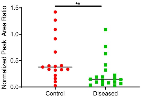 When closely examining levels of cis- and trans-EETs in different groups, we noted significantly lower cis-EETs compared to trans-EETs in control cardiac tissues (Figure 4). An increase in free radical oxidation, which is associated with pathology of many diseases, can lead to an increase of predominantly trans-EETs []. However, one factor that is easily overlooked in this case is the subjects’ age. Approximately 90% of our cardiac tissue are from elderly patients. Cardiac aging, which is linked to mitochondrial aging, ref. [] can be associated with an increase in ROS production and reduced mitochondrial respiratory capacity as indicated by a reduction in the phosphocreatine recovery time []. This elevated production of ROS can potentially lead to an increase in production of trans-EETs relative to cis-EETs in the control cardiac tissues that we observed in Figure 4. Unfortunately, we could not measure ROS levels in this study and the link between ROS levels and trans-EET levels cannot be verified. In diseased tissue, cis-EET levels are not significantly different than trans-EET levels (Figure 5). An earlier study in human cardiac tissue showed that control cardiac tissue possessed a lower number of apoptotic cardiomyocytes than diseased cardiac tissue []. Therefore, it is plausible that in diseased cardiac tissue, where sections of the hearts were dysfunctional, ROS production during mitochondrial respiration could be reduced. With reduced ROS production, it is anticipated that formation of trans-EETs, which are mediated by free radical oxidation, would also be lower [].