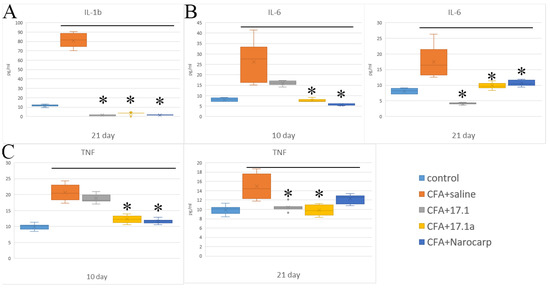 Changes in the level of pro-inflammatory cytokines ((A) IL-1b; (B) IL-6; (C) TNF) in the plasma 145 of mice after CFA-induced arthritis. (Control—control animals without CFA injection, CFA—animals with induced via CFA arthritis, + saline—animals were treated by phosphate buffered saline [PBS], +17.1a, +17.1, +Norocarp—animals were treated by a specified agent; n = 7 for each group). (p-value: * < 0.05).