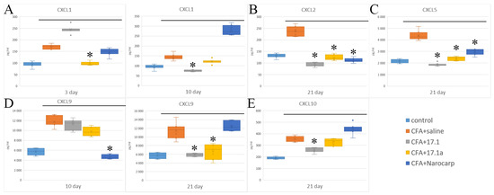 Changes in the level of chemokines ((A) CXCL1; (B) CXCL2; (C) CXCL5; (D) CXCL9; (E) CXCL10) in the plasma of mice after CFA-induced arthritis. (Control—control animals without CFA injection, CFA—animals with induced via CFA arthritis, +saline—animals were treated by phosphate buffered saline (PBS), +17.1a, +17.1, +Norocarp—animals were treated by a specified agent, n = 7 for each group). (p-value: * < 0.05).