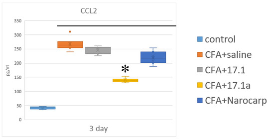 Changes in the level of CCL2 chemokine (CCL2) in the plasma of mice after CFA212 induced arthritis. (Control—control animals without CFA injection, CFA—animals with induced via CFA arthritis, +saline—animals were treated by phosphate buffered saline (PBS), +17.1a, +17.1, +Norocarp—animals were treated by a specified agent, n = 7 for each group). (p-value: * < 0.05).