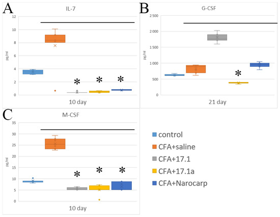 Changes in the level of hematopoietic cytokines ((A) IL-7) and growth factors ((B) G-CSF; ((C) M-CSF) in the plasma of mice after CFA-induced arthritis. (Control—control animals without CFA injection, CFA—animals with induced via CFA arthritis, +saline—animals were treated by phosphate buffered saline (PBS), +17.1a, +17.1, +Norocarp—animals were treated by a specified agent, n = 7 for each group). (p-value: * < 0.05).
