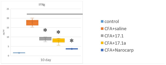 Changes of the level of cytokines in the effector phase of immune response (IFN-γ) in the plasma of mice after CFA-induced arthritis. (Control—control animals without CFA injection, CFA—animals with induced via CFA arthritis, +saline—animals were treated by phosphate buffered saline (PBS), +17.1a, +17.1, +Norocarp—animals were treated by a specified agent, n = 7 for each group). (p-value: * < 0.05).