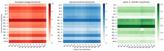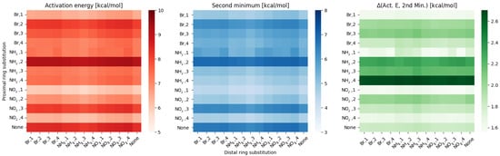 Heatmaps of the activation energy (left), second minimum (middle) and the difference between them (right) for different substitution patterns in the para compounds group.