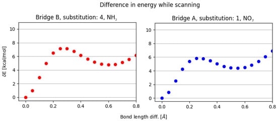 As for the difference between the activation energy and parameters of the second minimum—it indicates how ‘flat’ the energy profile will be. The largest difference is visible for the NH, 4 substitution on proximal ring, while the lowest for NO, 1 (NH, 1 following as the second closest). This corresponds well with the energy profiles depicted in Figure 2.