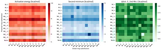 Heatmaps of the activation energy (left), second minimum (middle) and the difference between them (right) for different substitution patterns in the ortho compounds group.