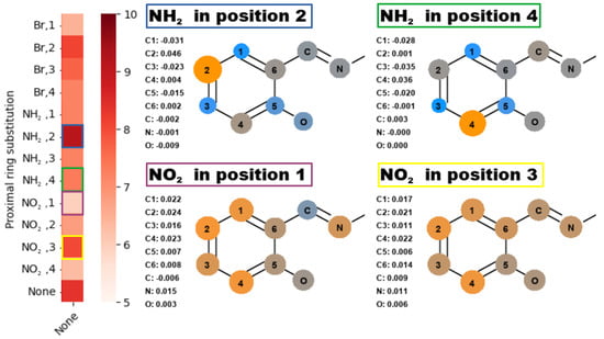 Differences of charge distribution for the selected proximal substitution patterns compared to the non-substituted structure, and related to their respective fields on the activation energy heatmap from Figure 1.